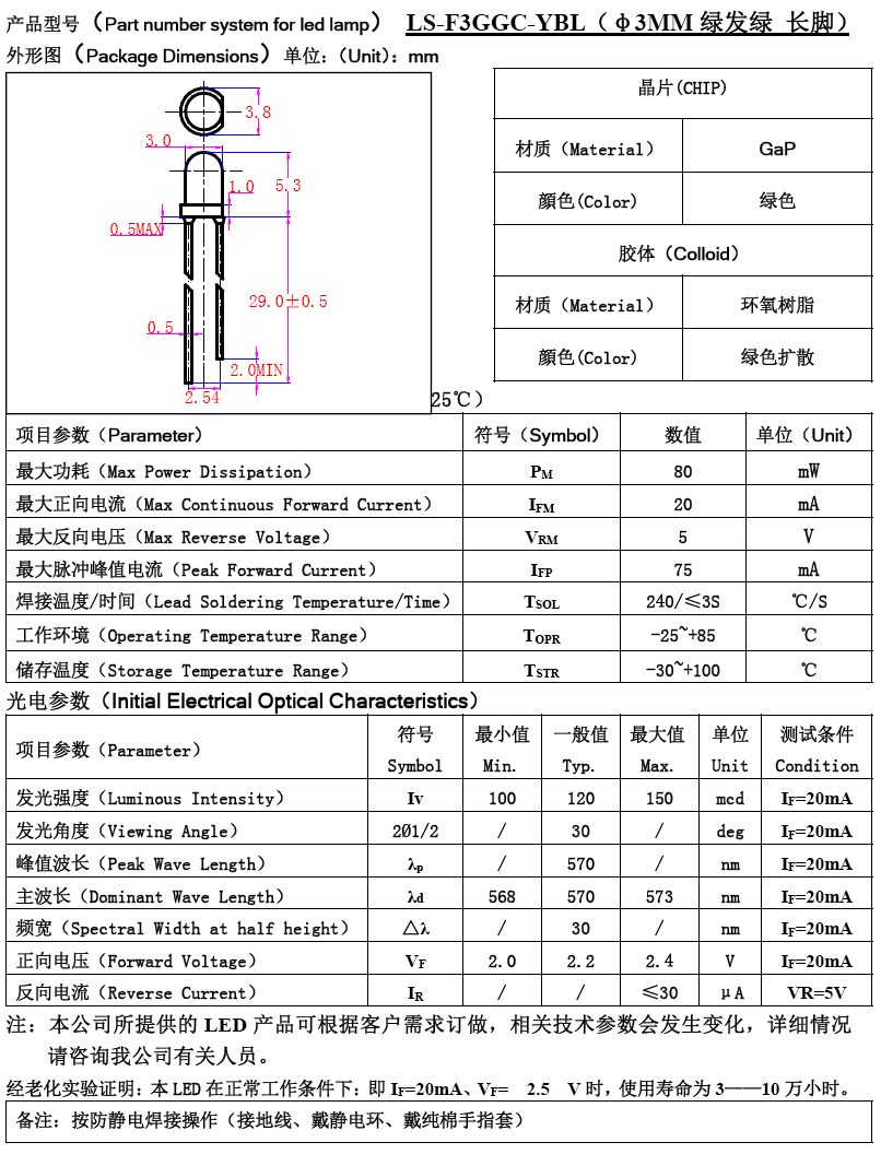 φ3 綠 570nm/2.2Vf/120mcd【ROHS】