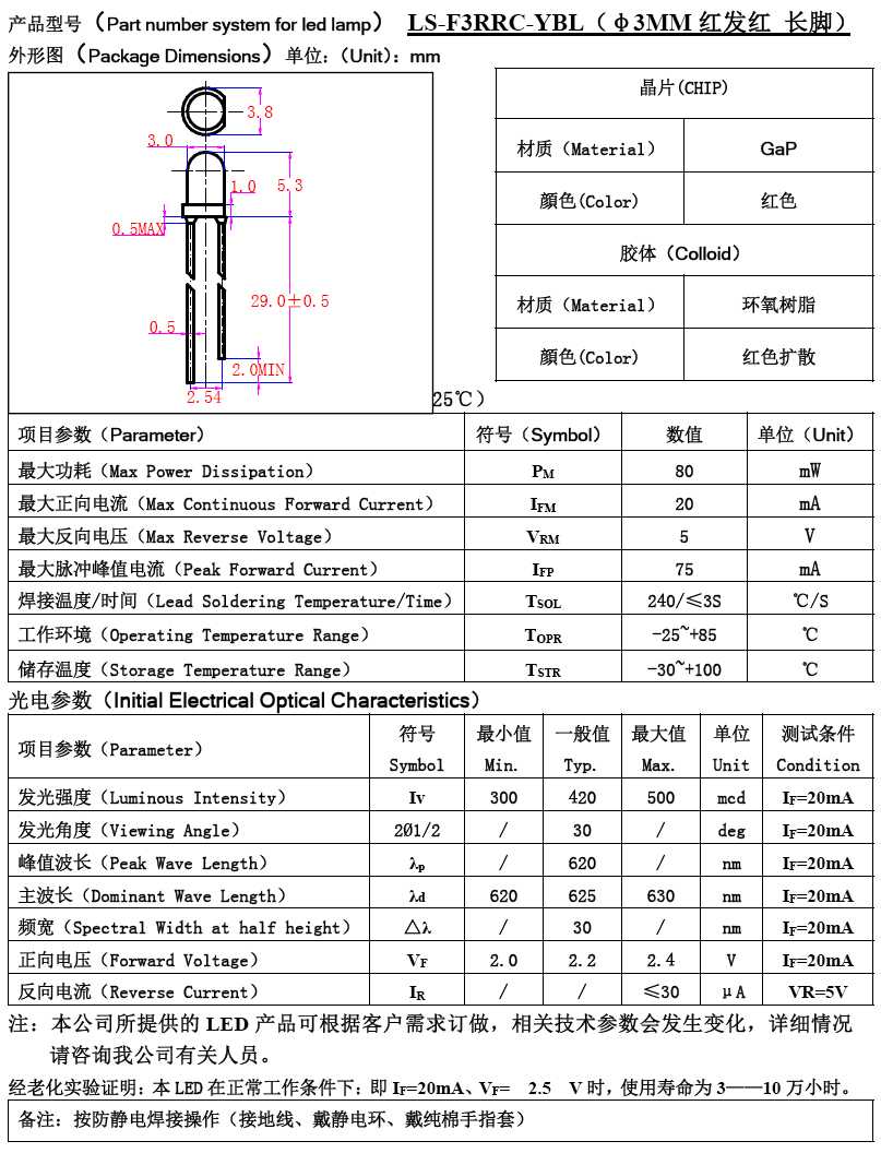 φ3 LED 紅光 620nm/2.2V