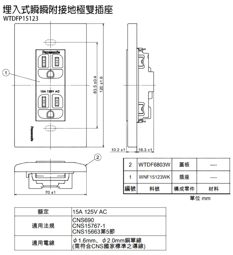 埋入式瞬瞬附接地極雙插座(附蓋板)