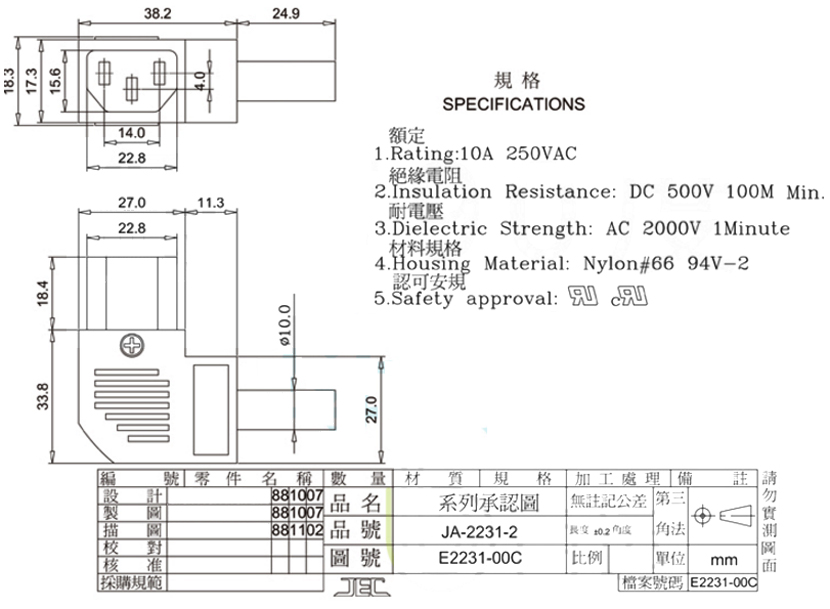 C13 品字插頭純銅 10A/250V 側彎90°母頭