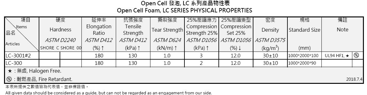 LC系列為PE/EVA材質,並具獨特的半開孔氣室結構,發泡體內部氣孔相互連通,有良好的過濾、密封功能。可運用於3C產品的密封條、建築用的隔熱材、吸音材等。本公司亦有提供達到UL94-HF1難燃等級與非鹵素的Open Cell產品。