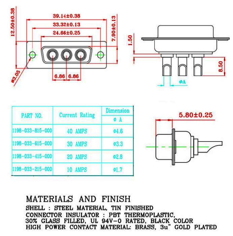 D-SUB連接器-3W3-公頭-車針DB型 3芯混裝大電流直針孔焊線式