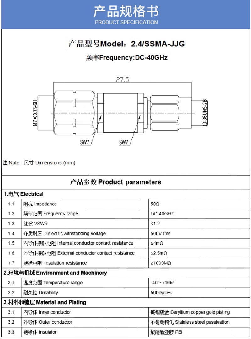 毫米波轉接器2.4公轉SSMA公 DC-40G VSWR1.2/50ohm
