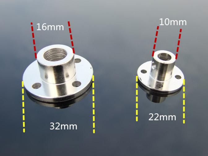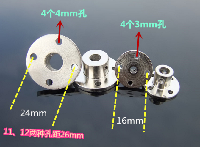 內徑7mm、8mm、10mm、11mm、12mm的尺寸是:圓柱外徑16mm,圓柱高度10mm,整體高度13mm,固定孔螺絲是M4。(注意11、12、14mm的孔距是26mm,其他的是24mm)