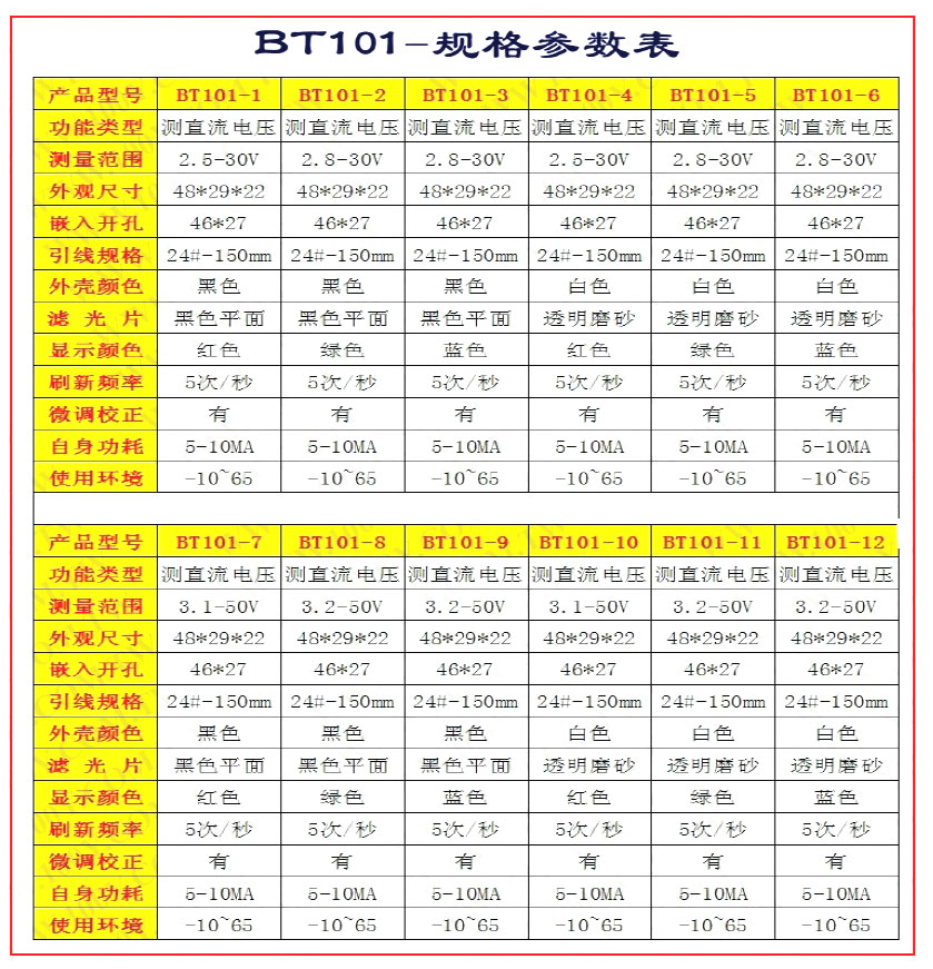2.5~30V 09/黑殼藍字測3.0~50V 02/黑殼綠字測2.8~30V 08/黑殼綠字測3.0~50V 05/白殼綠字測2.8~30V 12/白殼藍字測3.0~50V。04/白殼紅字測2.5~30V 11/白殼綠字測3.0~50V