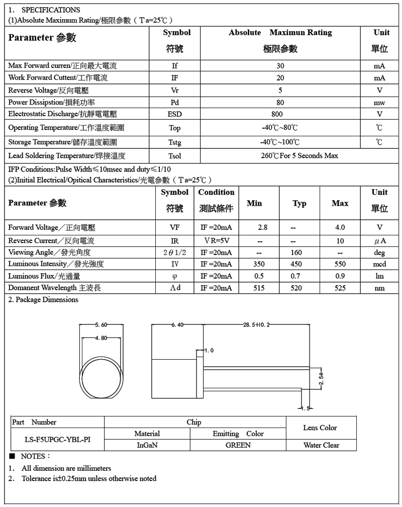 5mm平頭有邊透明體 綠光 長腳29mm,1K/R