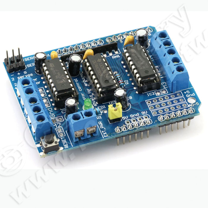 缺點:I/O 佔用較多在同時驅動四路電機的情況下(相對Arduino I/O 少的版本而言),小功率。可驅動4 路直流電機或者2 路步進電機的同時還能驅動2 路舵機,支持最新Arduino UNO, Arduino Mega 2560您可以這樣搭配:驅動四路直流電機和兩路舵機,驅動兩路直流電機和一路步進電機和兩路舵機驅動兩路步進電機和兩路舵機Arduino 是一款很好的電子製作入門,有了電機擴展板可以很好的成為機器人開發平臺。這裡介紹一款能驅動各種簡單到稍複雜項目的全功能的電機擴展板。這是一款常用的直流電機驅動模組,採用293D 晶片小電流直流電機驅動晶片。管腳被做成了Arduino 相容的,也方便了愛好者快速的基於Arduino 的開發。