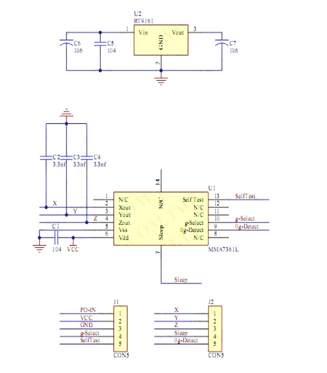 1.板載MMA7361(取代MMA7260)低成本微型電容式加速度感測器;