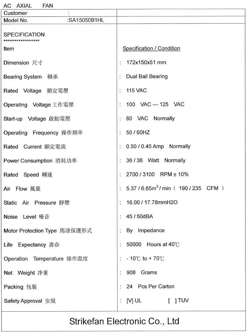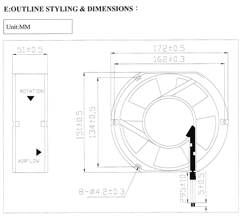 110-120VAC 帶線式風扇 0.5/0.45A 172*150*51mm