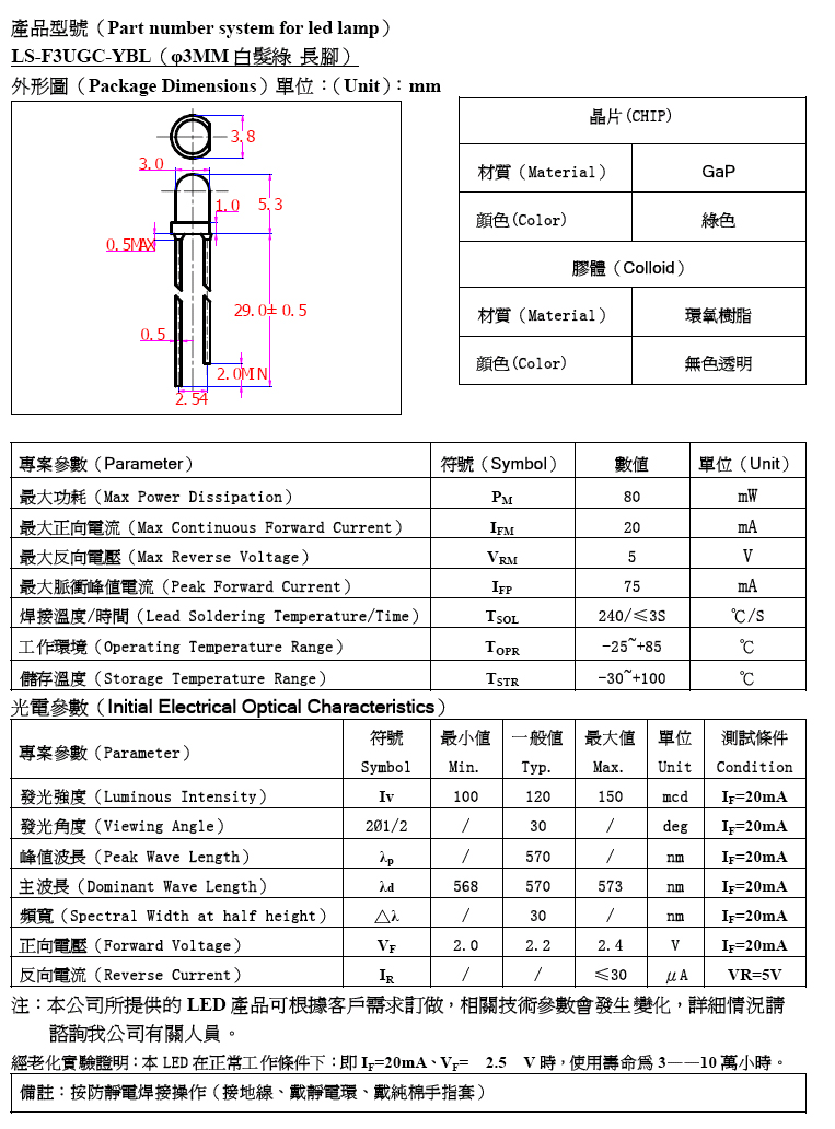 φ3mm 綠色 568-573nm/2.2V/100-150mcd