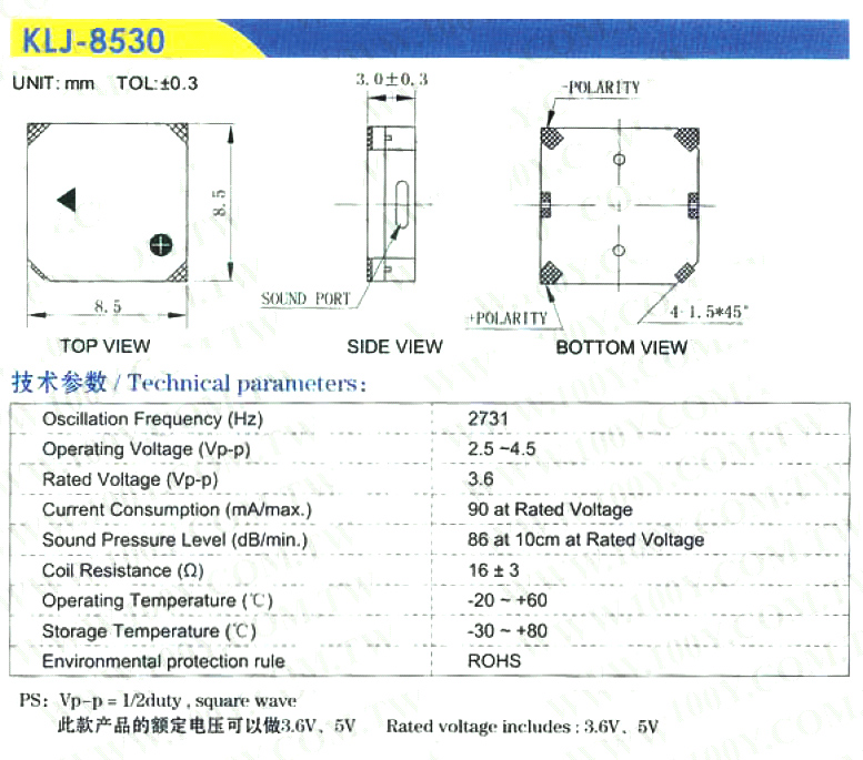 KLJ-8530 SMD電磁式貼片蜂鳴器 3.6V