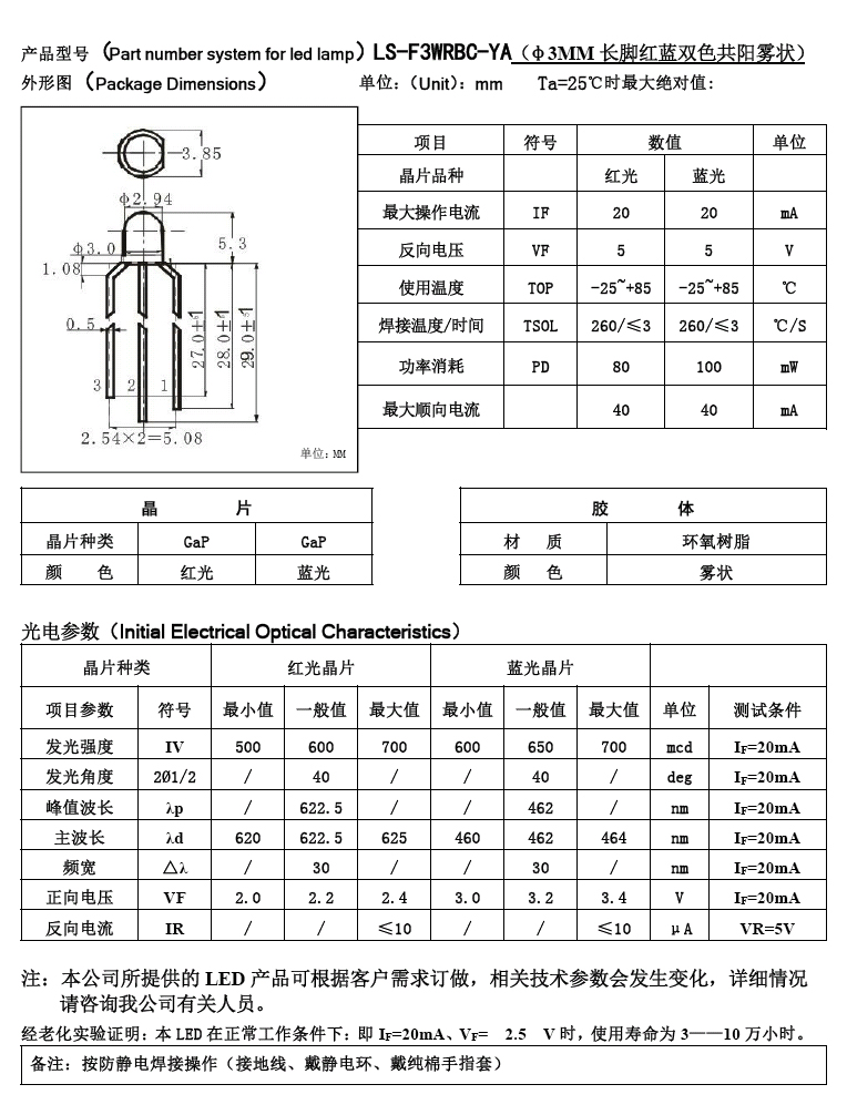 3mm紅藍雙色LED,霧狀膠體,共陽