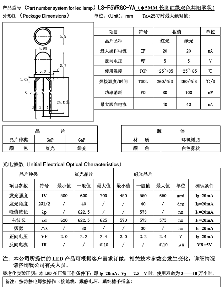 5mm紅綠雙色LED,霧狀膠體,共陽