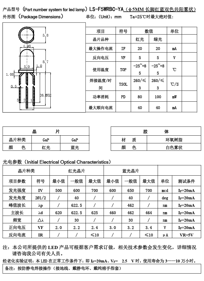 5mm紅藍雙色LED,霧狀膠體,共陽