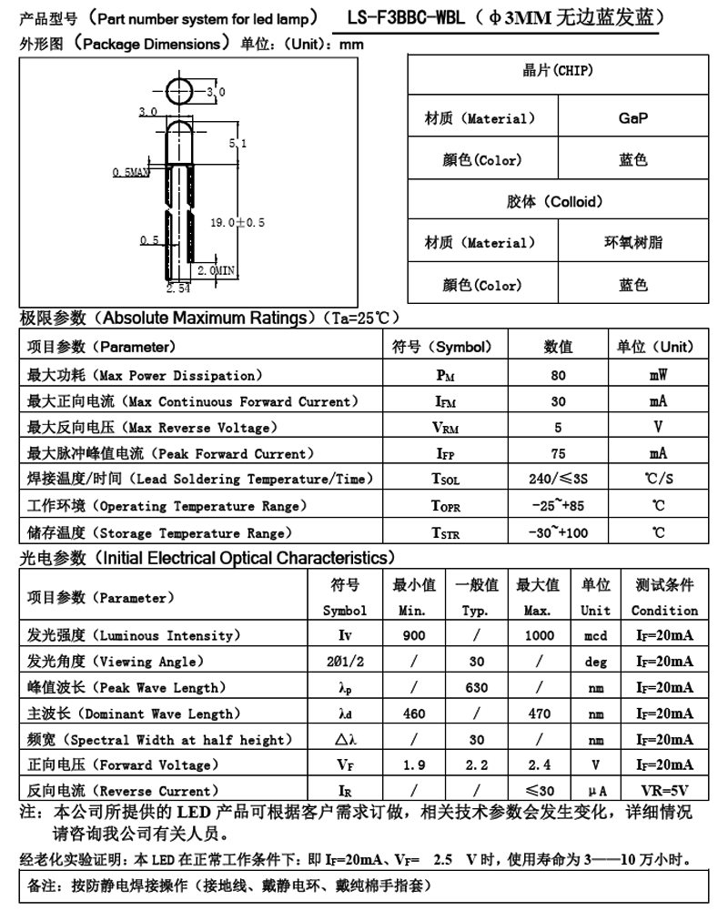 單顆藍色LED含座子