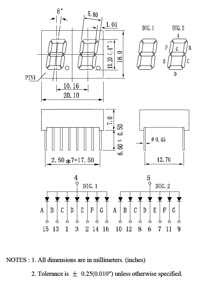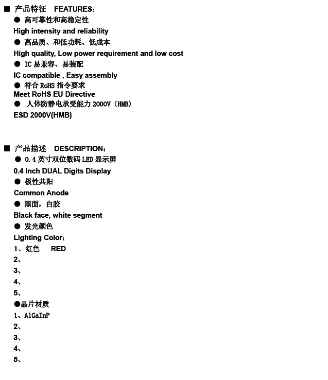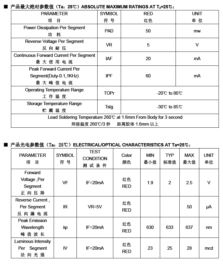 0.4" 2字共陽/高亮紅 633nm/25mcd