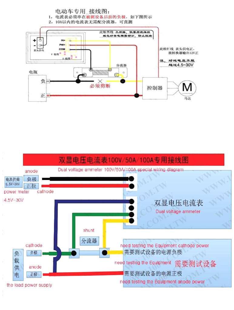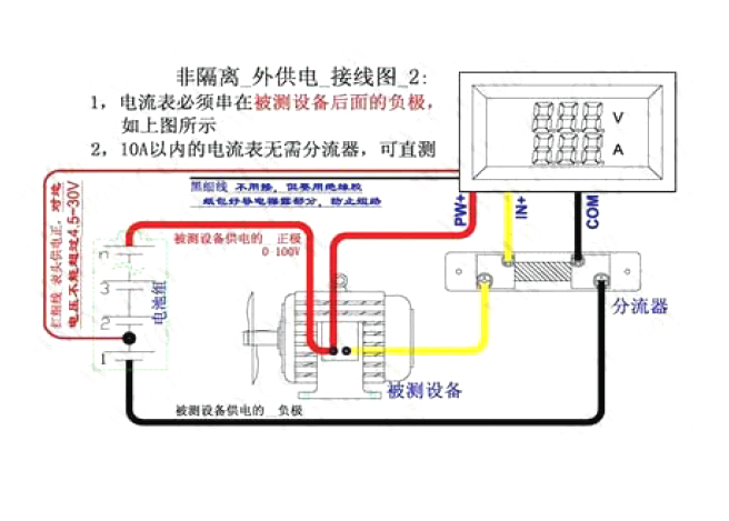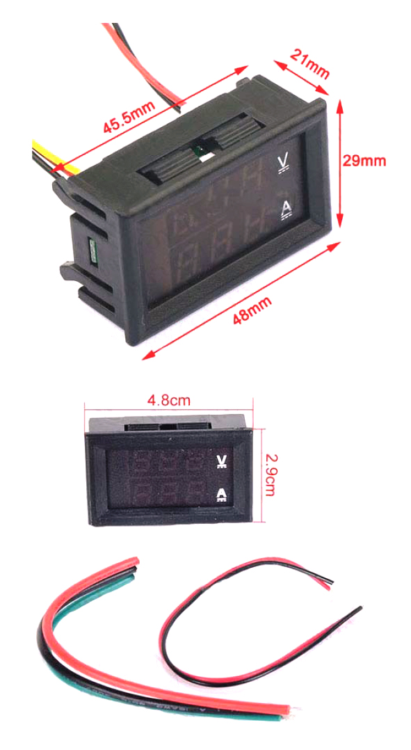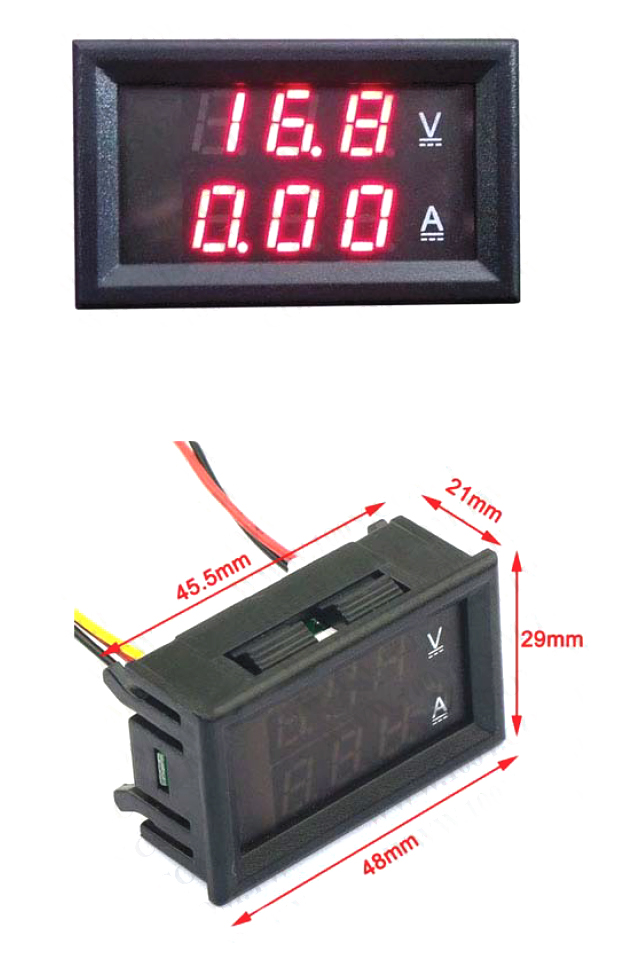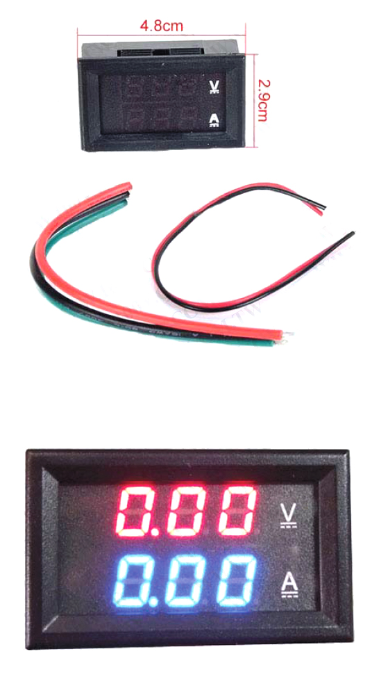直流雙顯電壓電流錶 本雙色雙表體積小巧,可同時同屏顯示電壓、電流 本表頭採用是共地設計,即測量端的地線與供電端的地線是相通的。本表供電範圍:DC4.5~30V,供電反接不會燒,注意:最高輸入電壓不能超過30V,否則有燒毀的危險。