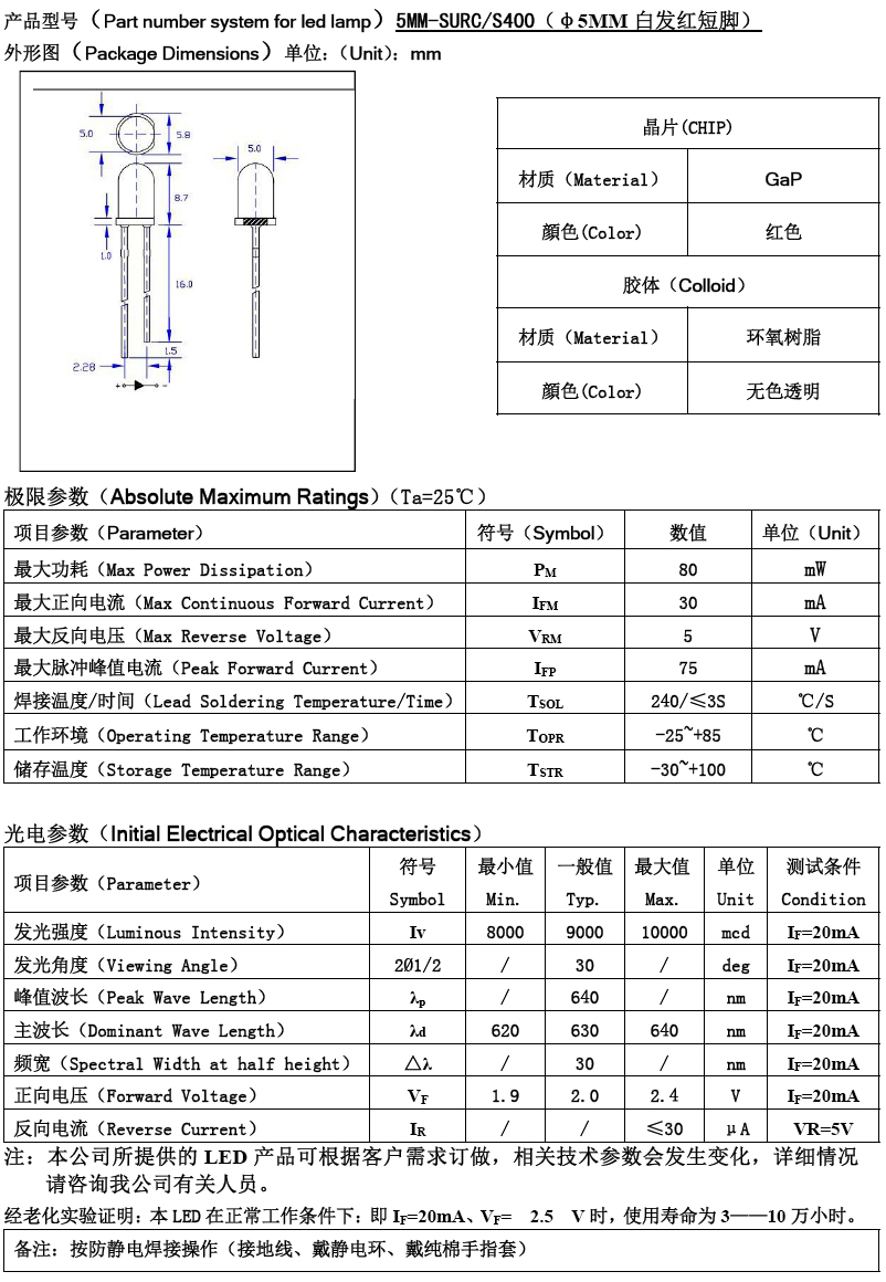φ5 紅色 620-640nm/2V/8000-10000mcd