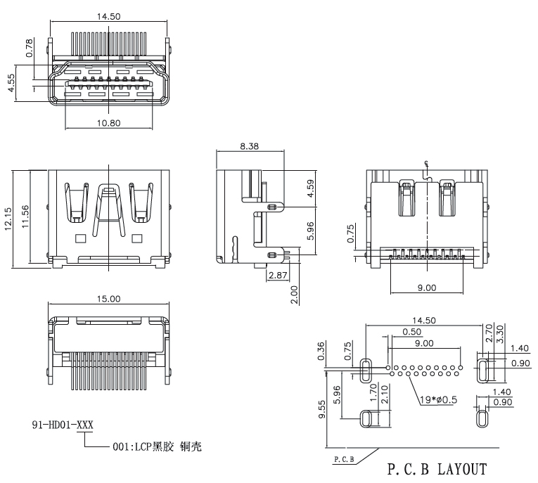 端子:接觸區域鍍金1u",焊接區鍍亮錫100-200u"