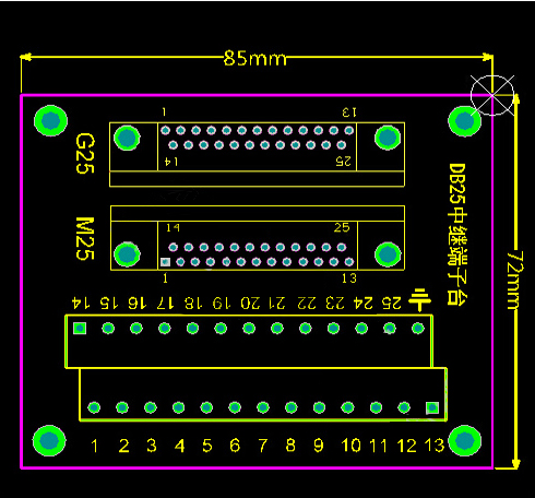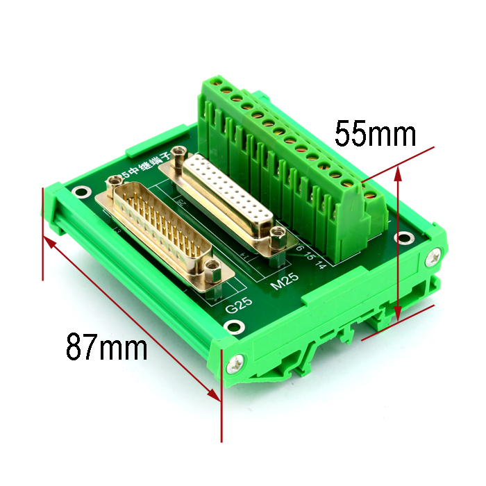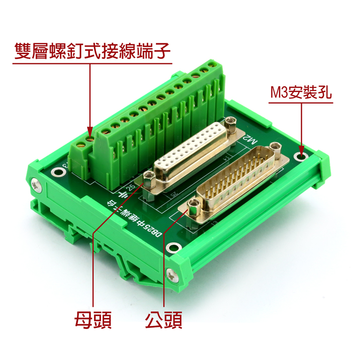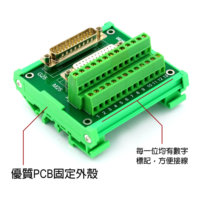 DB25轉端子公母兼容模塊採用全銅DB25座,抗氧化接觸更好;接線端子間距5.08mm,螺絲孔直徑3mm