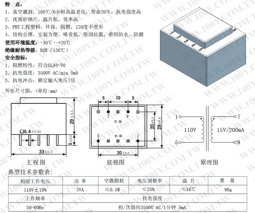 110V 3VA,單輸出15V
