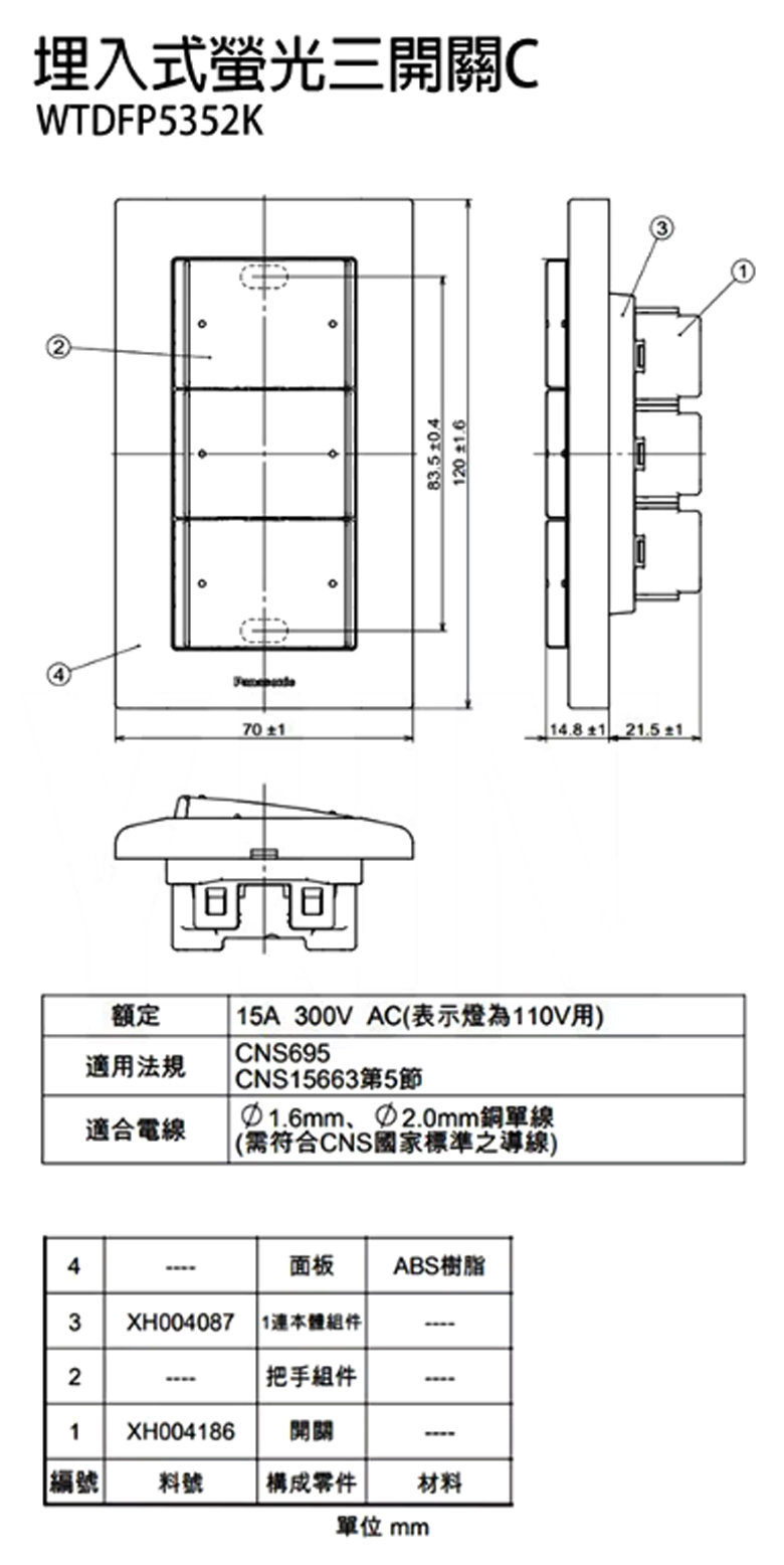 埋入式螢光開關C(參) (附蓋板)15A 110V AC用
