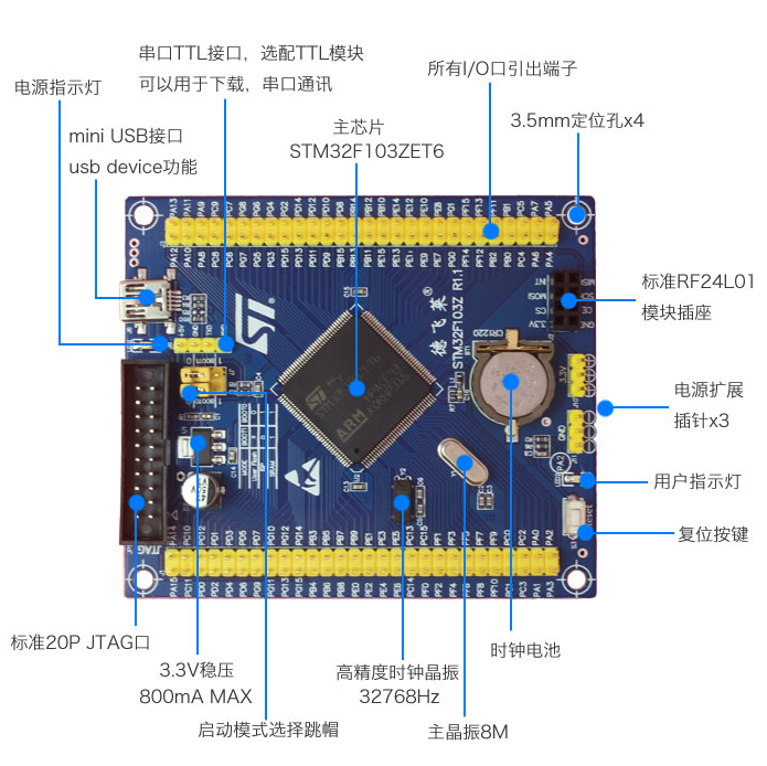 模擬串口功能,上述功能需要有配套的外設才能實現,ST官方有對應的常式和資料請自行下載,本產品對擴展的
