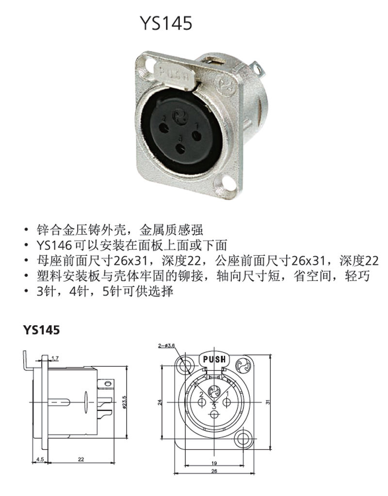 3芯卡儂母座短尾XLR母底座卡龍插座