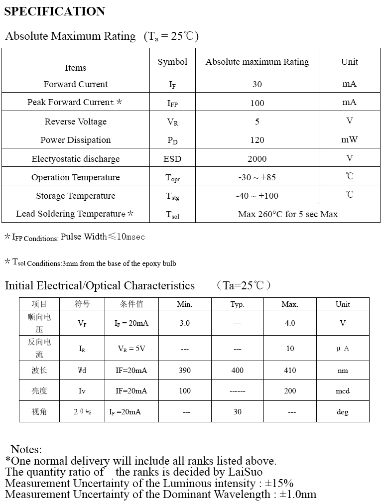 φ3 LED 紫光 390-410nm/3.0-4.0V