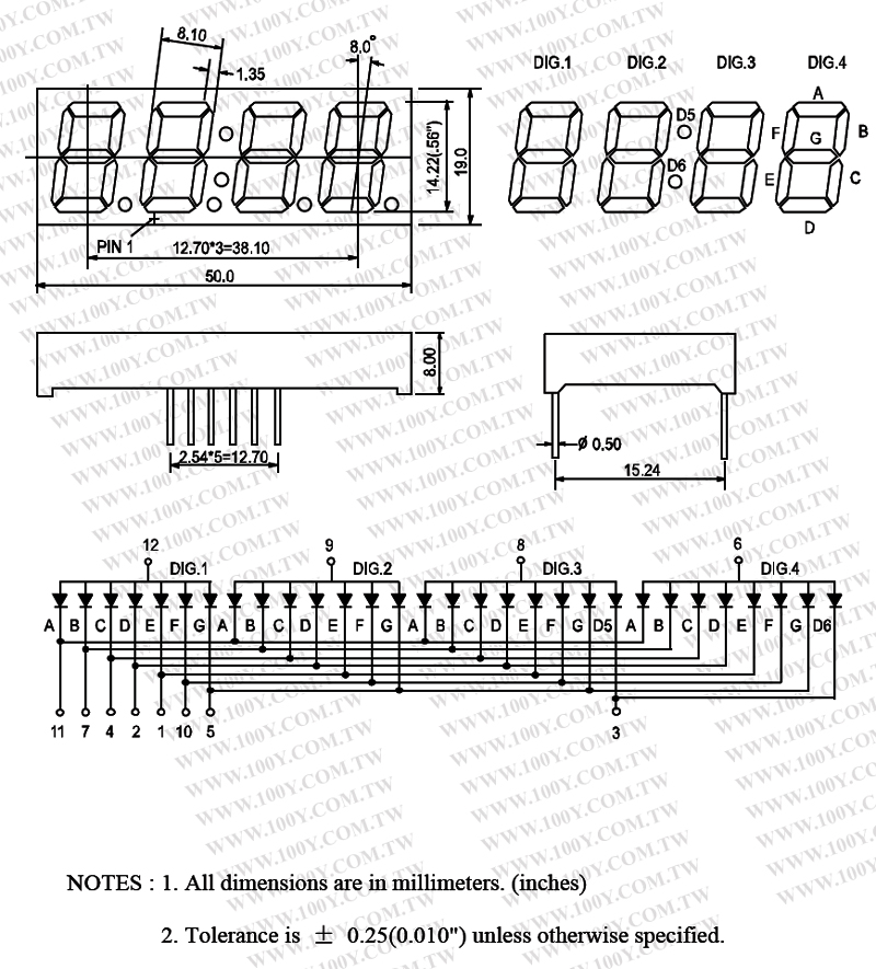0.56" 4字時鐘型七段顯示器 共陽 高亮紅色