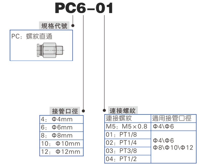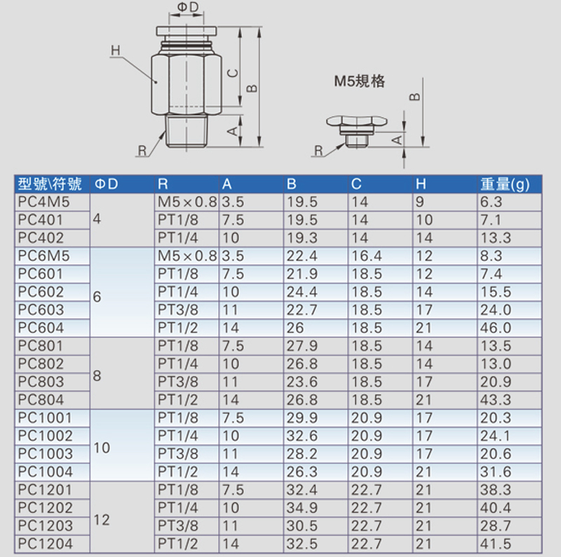 M5*0.8銅質PC螺紋直通接頭/接管口徑6mm