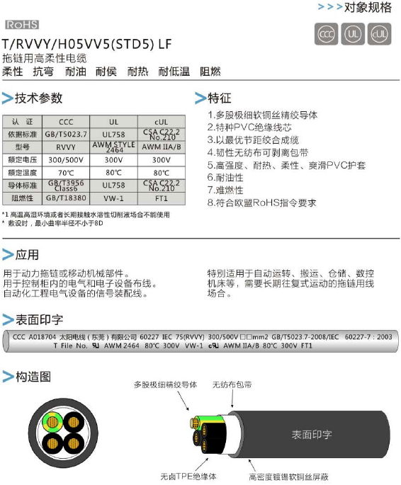 太陽牌耐彎曲拖鏈動力線 不帶屏蔽 4C*0.75mm2 300V 80℃