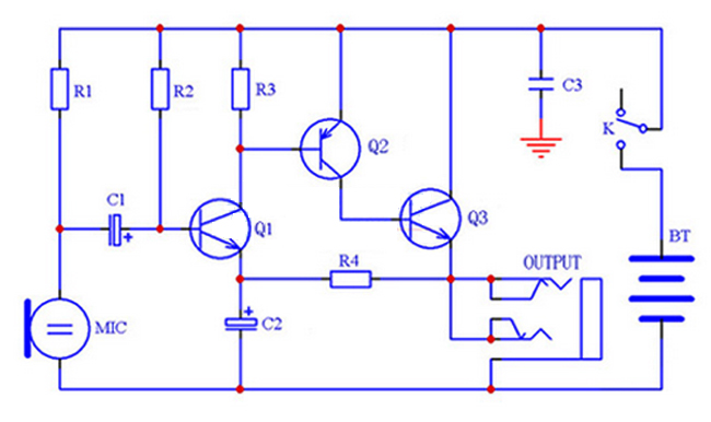 駐極體話筒MIC將周圍環境的聲音振動變為電信號經C1耦合到Q1進行放大,然後又經Q2、Q3兩級放大,由集電極 (注:Q2與Q3接成複合管,其等效為一PNP管) 輸出,直接驅動耳機發聲。以下原理圖中的元件參數在紙質說明書