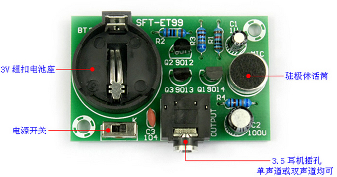 可聽到10米範圍內的聲音。只要按圖示正確焊接,接上3V鈕扣電池,插上耳機 (單聲道或雙聲道耳機均可),將開關