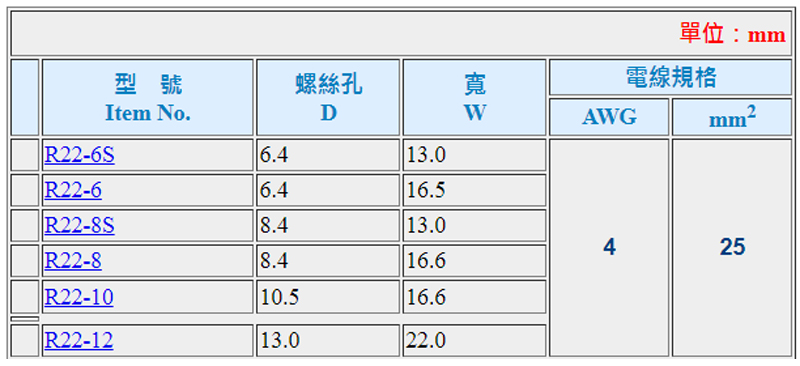 R型端子 4AWG (寬W*螺絲孔D:16.5*8.4)