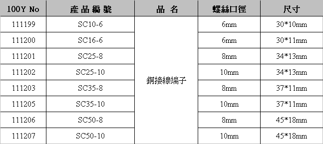 名稱:SC系列窺口銅接線端子別名銅鼻子、短線鼻子、銅接線鼻子、銅端子