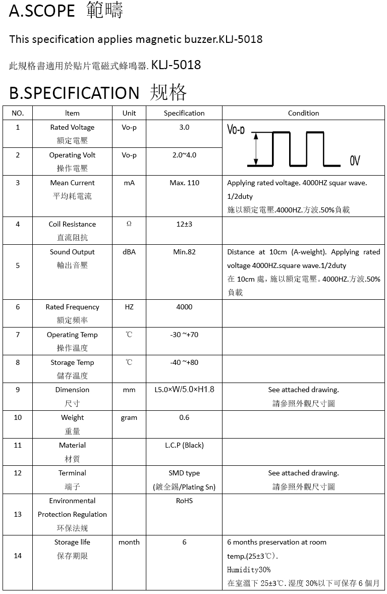 KLJ-5018 3V 微型貼片蜂鳴器