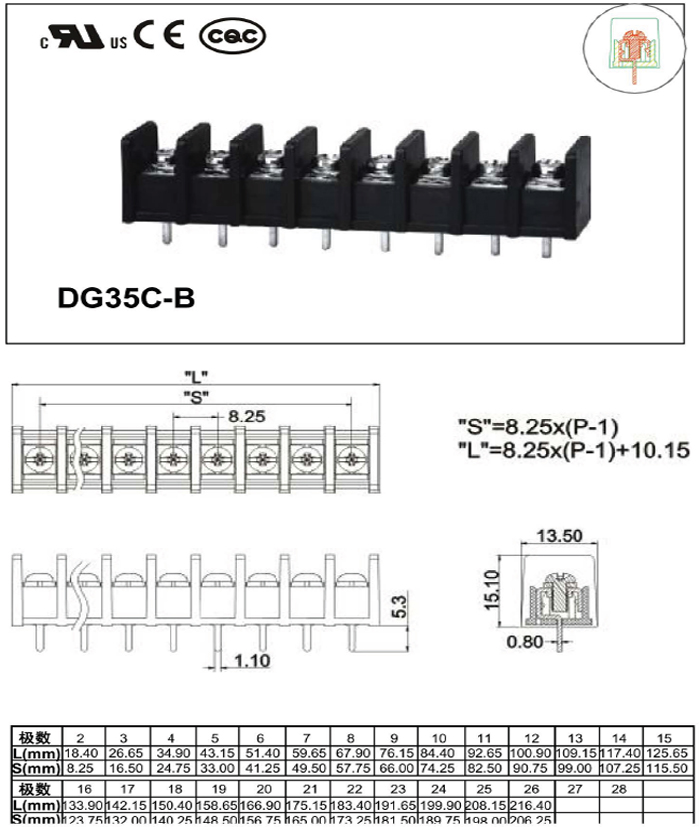 #113250 DG35C-B-8.25-2P 柵欄式接線端子2P P:8.25mm
