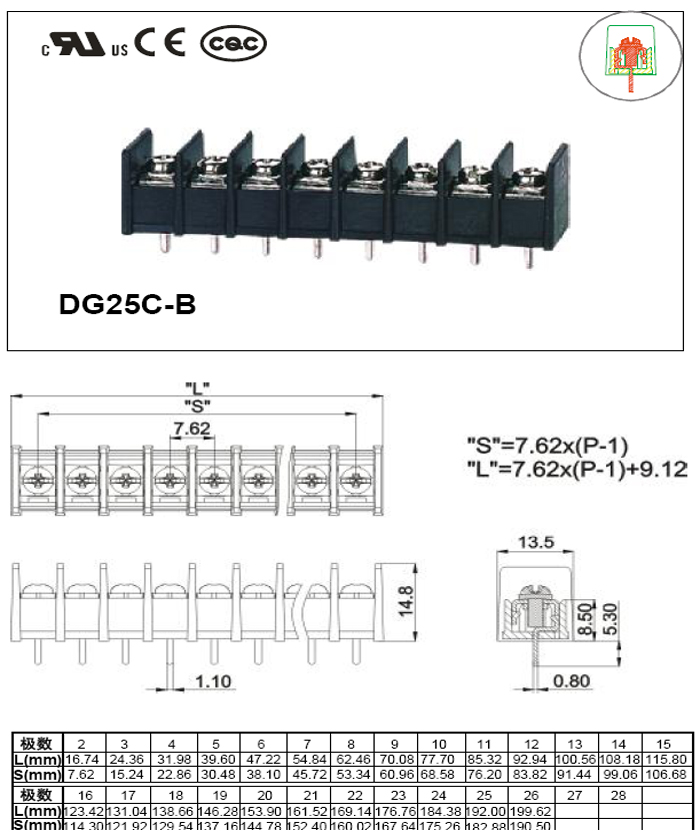 #113408 DG25C-B-7.62-5P 柵欄式接線端子5P P:7.62mm