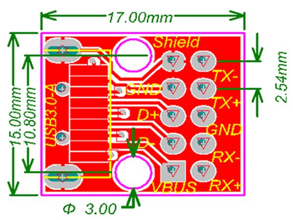 尺寸:15*17mm,含2個板子3mm固定螺絲孔,10個2.54mm間距焊接針孔(如下圖):