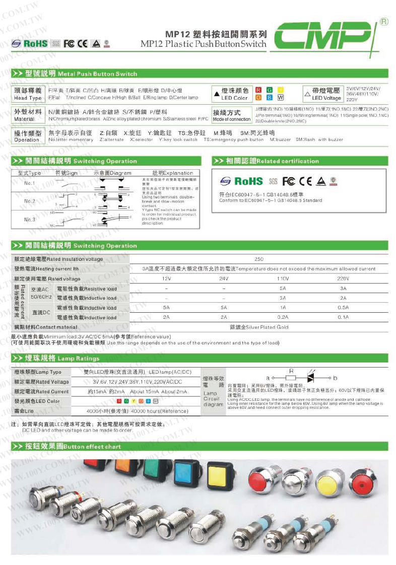 Φ12mm自鎖型按鈕開關 黃色 1NO