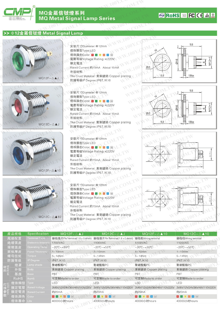 Φ12mm 金屬信號燈 焊接式 LED12V 紅色