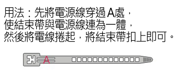 使用方法:先將電源線穿過A處,使結束帶與電源線連為一體,然後將電線捲起,將結束線扣上即可