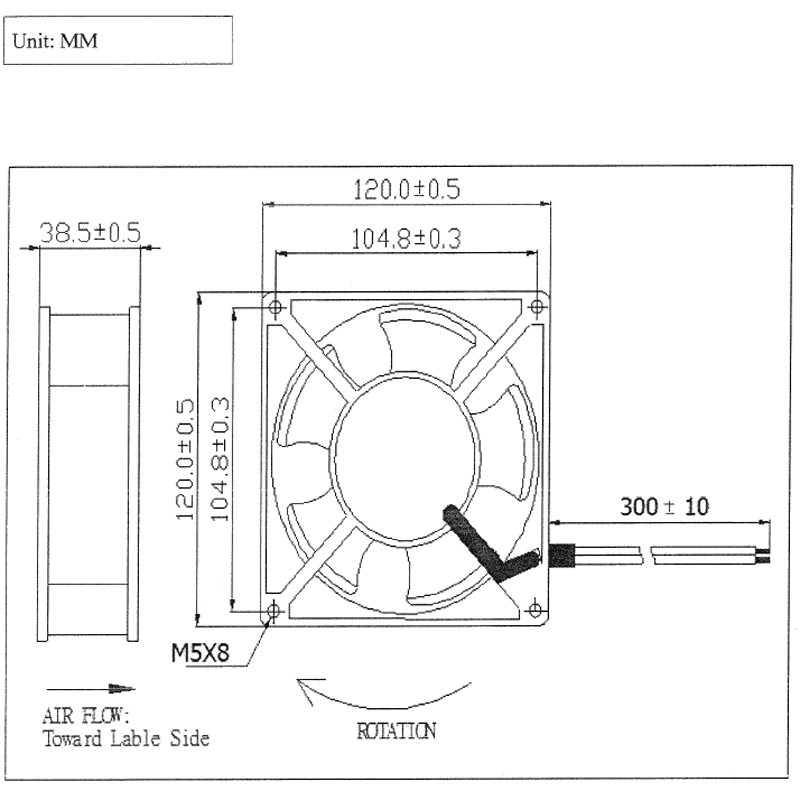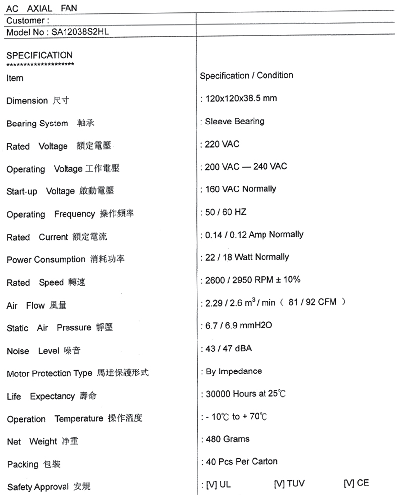 220V帶線式風扇 120*120*38.5mm 0.12A