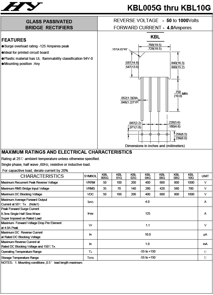HY_KBL005G thru KBL10G 整流橋式器