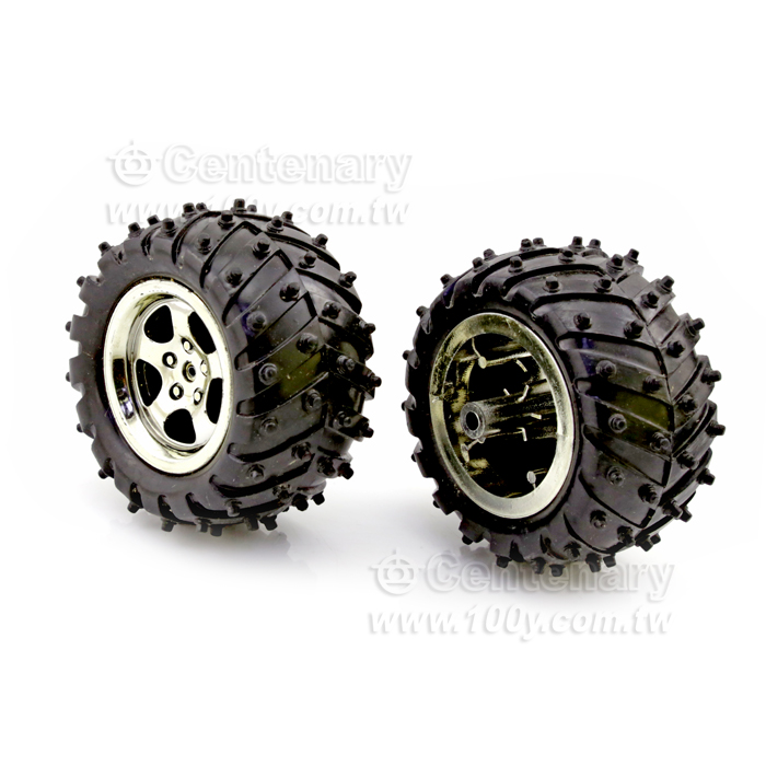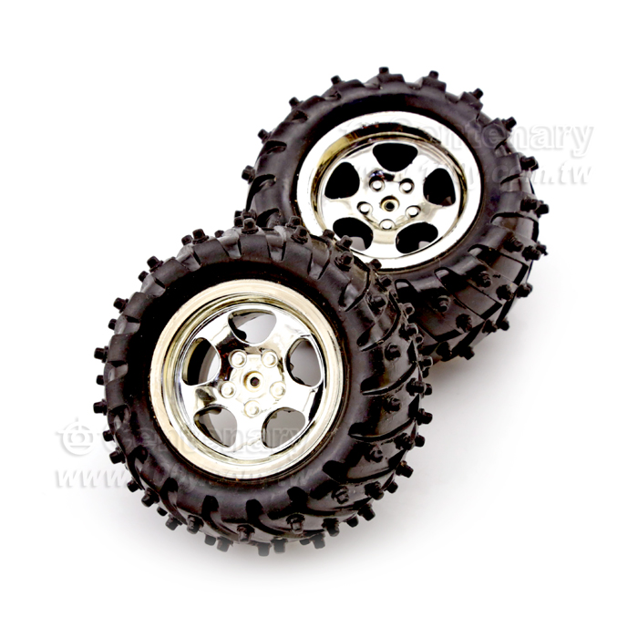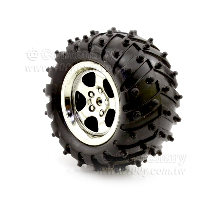 越野車輪3*55mm。外部是橡膠材質,內部輪轂是銀色電鍍塑料材質,外部橡膠偏硬,耐磨,抓地力強