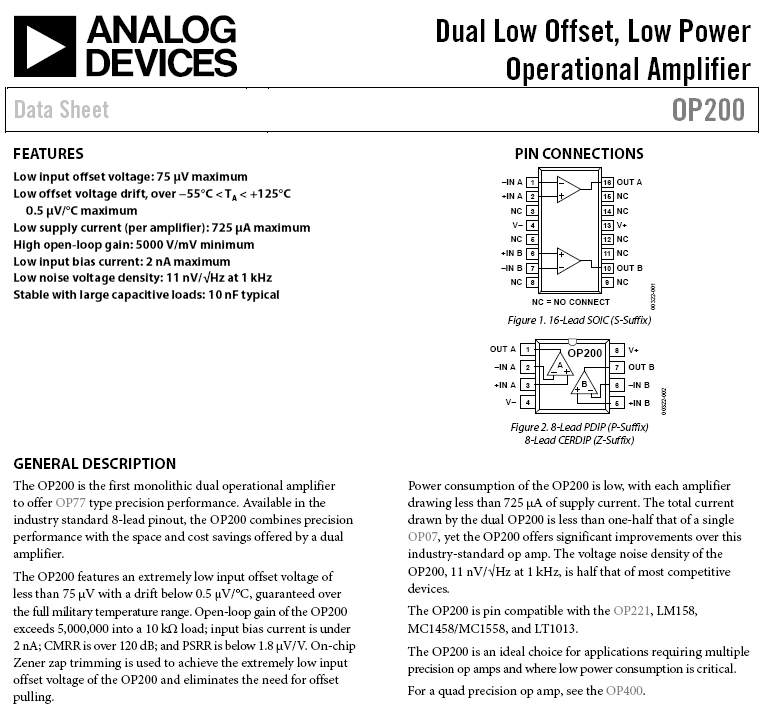OP200是第一款提供OP77型精密性能的單晶片雙通道運算放大器。它採用工業標準8引腳排列配置,兼具精密性能及雙通道放大器節省空間和成本的優勢。