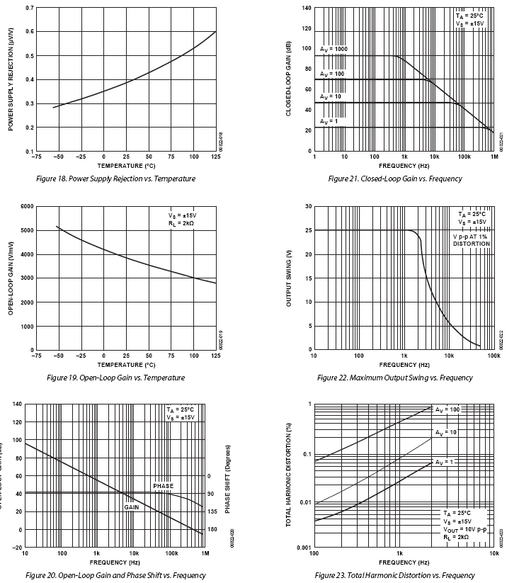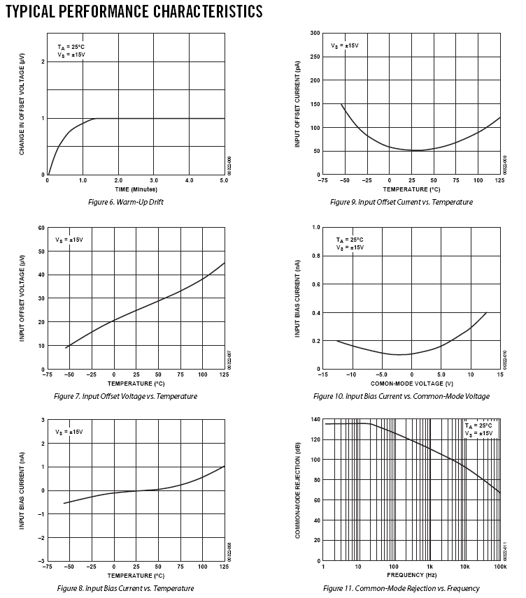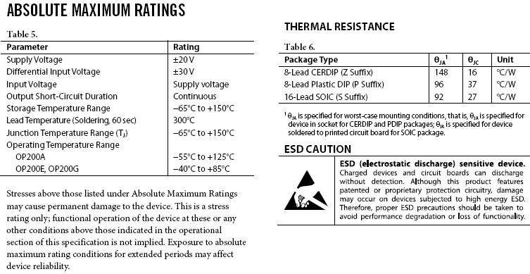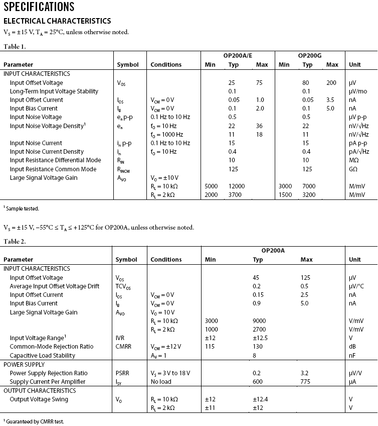 在整個軍用溫度範圍內,OP200具有小於75 μV的極低輸入失調電壓,漂移小於0.5 μV/°C。開環增益超過500萬(10 kΩ負載),輸入偏置電流低於2 nA,共模抑制(CMR)高於120 dB,電源抑制比(PSRR)小於1.8 μV/V。OP200的極低輸入失調電壓通過片內齊納擊穿(Zener zap)調整而實現,無需進行失調牽引。