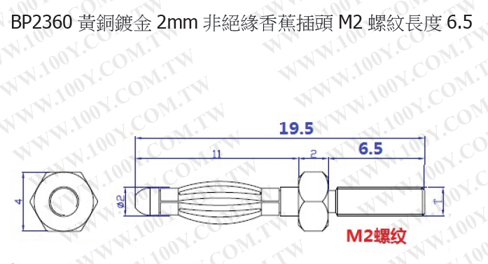 裸露香蕉插頭-4mm/M2*6.4-六角鍍金