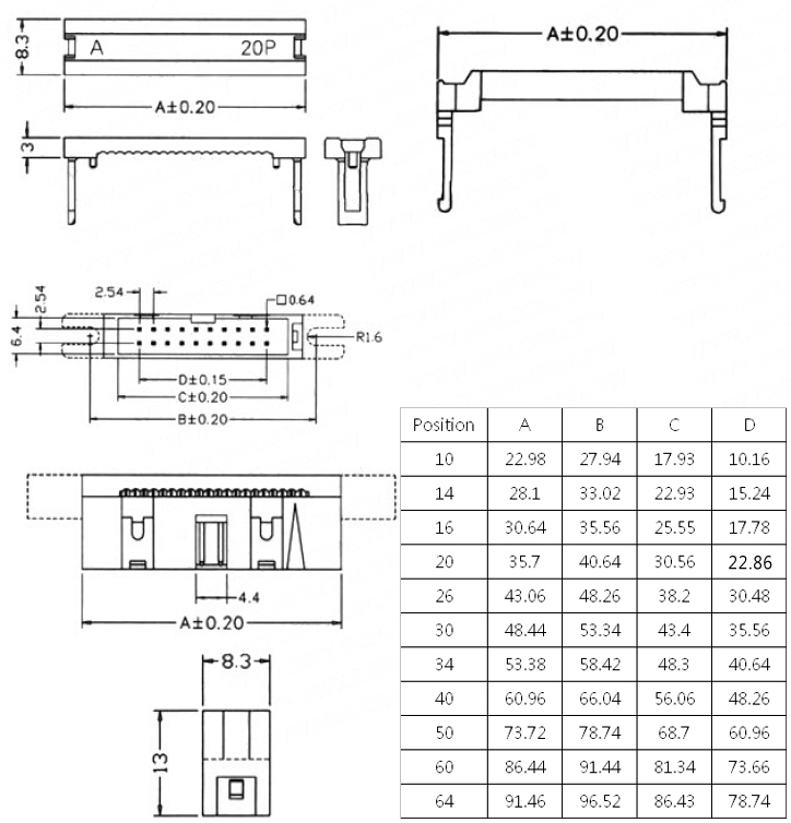 Cable: 1.27mm (0.050") pitch flat cable